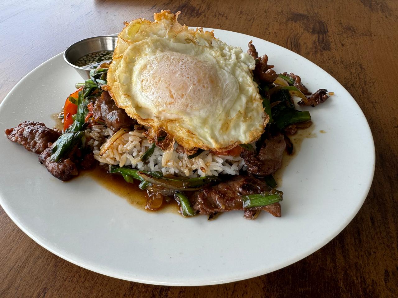 On Jasmine Rice, Sliced Beef Sautéed with Cherry Tomatoes, Flowered Chives, Onions, Fried Egg
