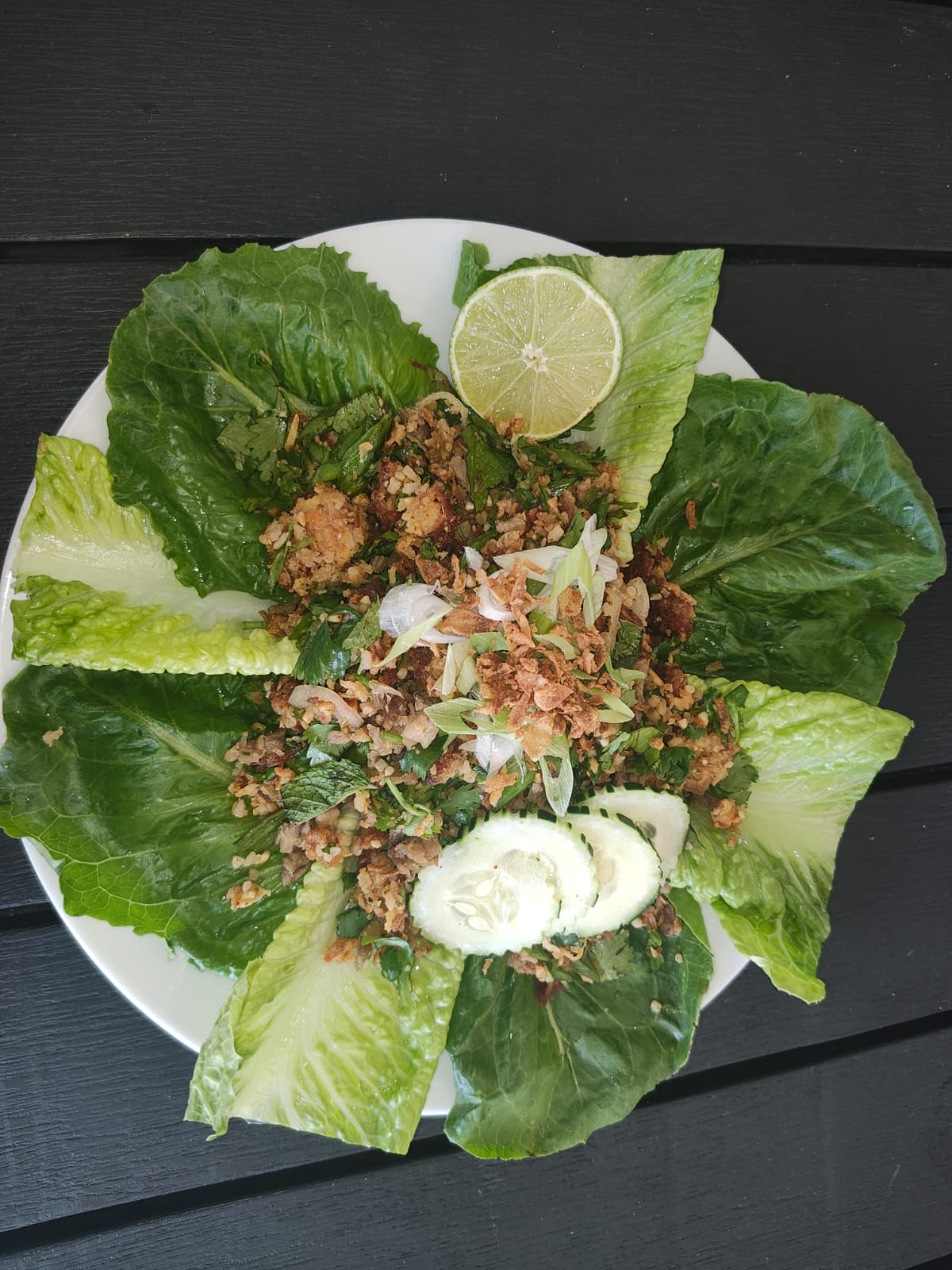Fried Coconut and Curry Rice, Crumbled, Mixed with Coriander, Shallot, Mint, Lime, , Eat the Kaho Dumpling with Romaine…
