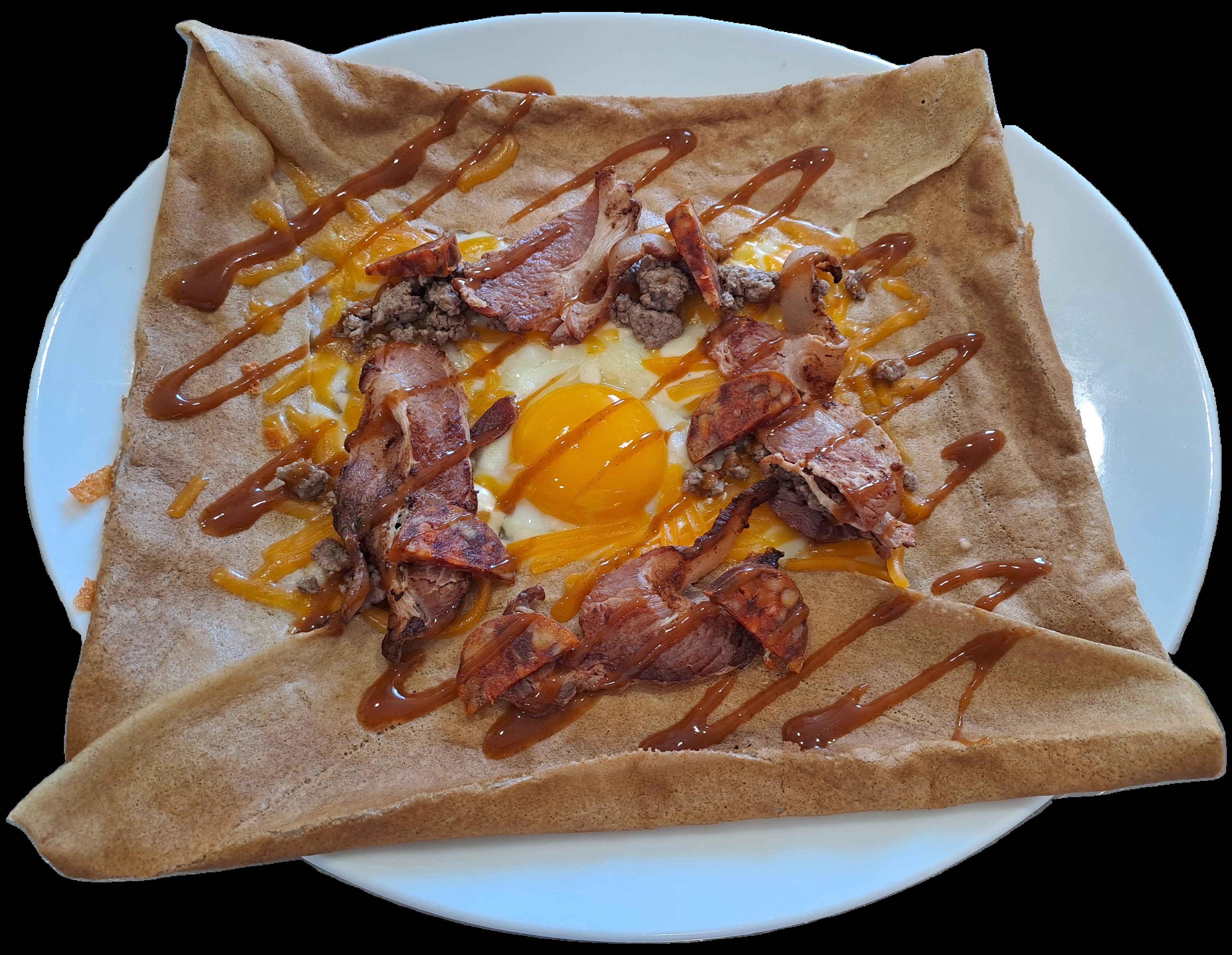 Mozzarella/Cheddar, Œuf, Bœuf Haché, Bacon, Chorizo, Sauce BBQ