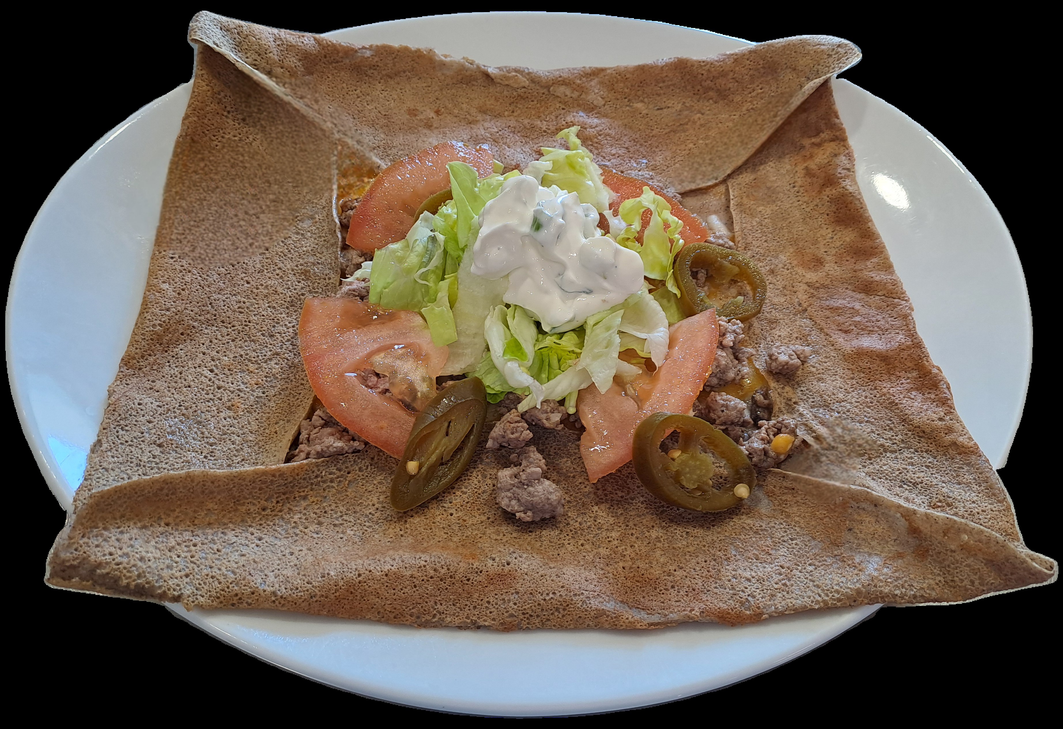 Mozzarella/Cheddar, Bœuf Haché, Jalapeños, Salade, Tomate, Crème Fraiche aux Herbes