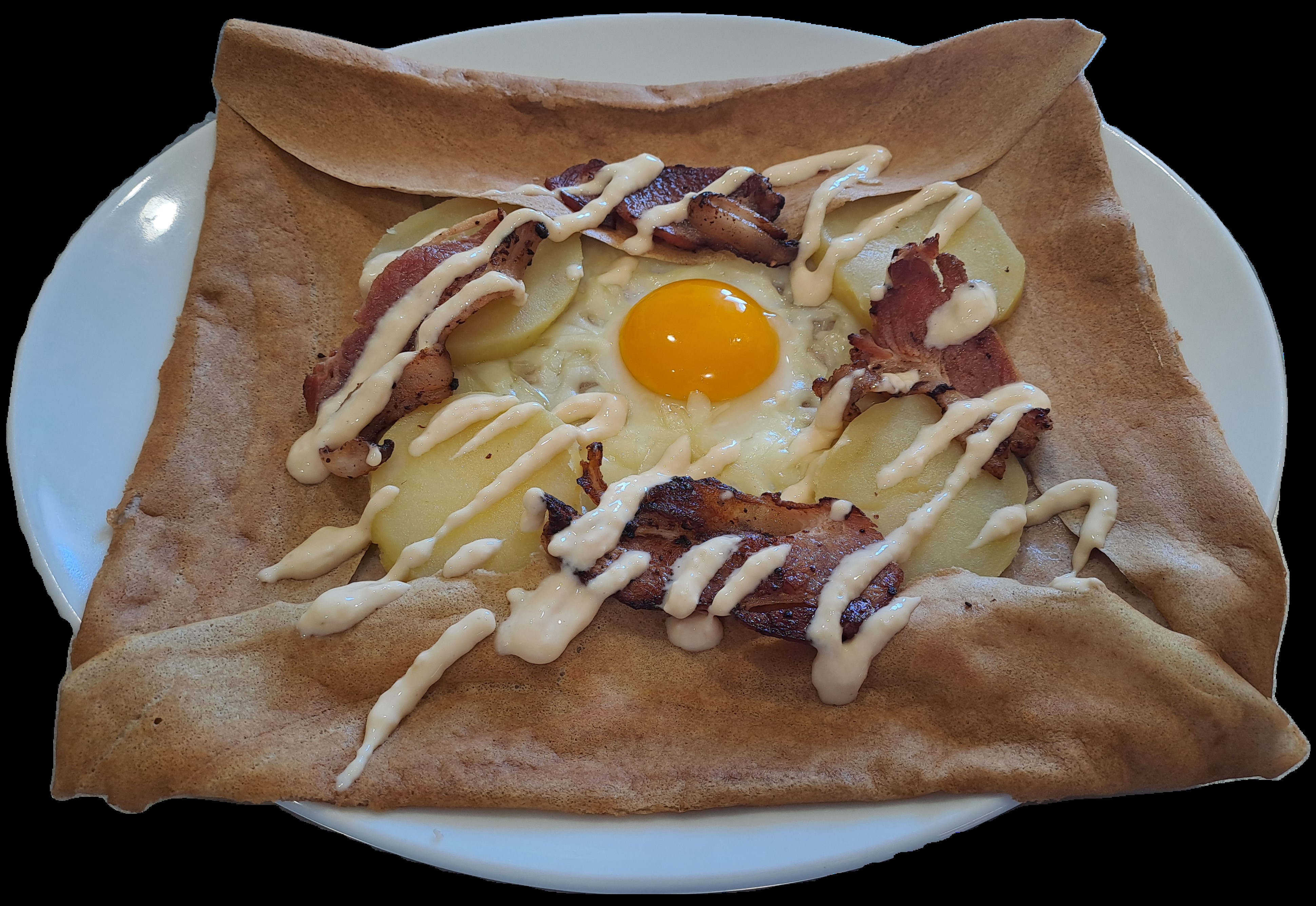 Mozzarella/Emmental, Oeuf, Bacon, Pomme de Terre, Sauce Béchamel Maison