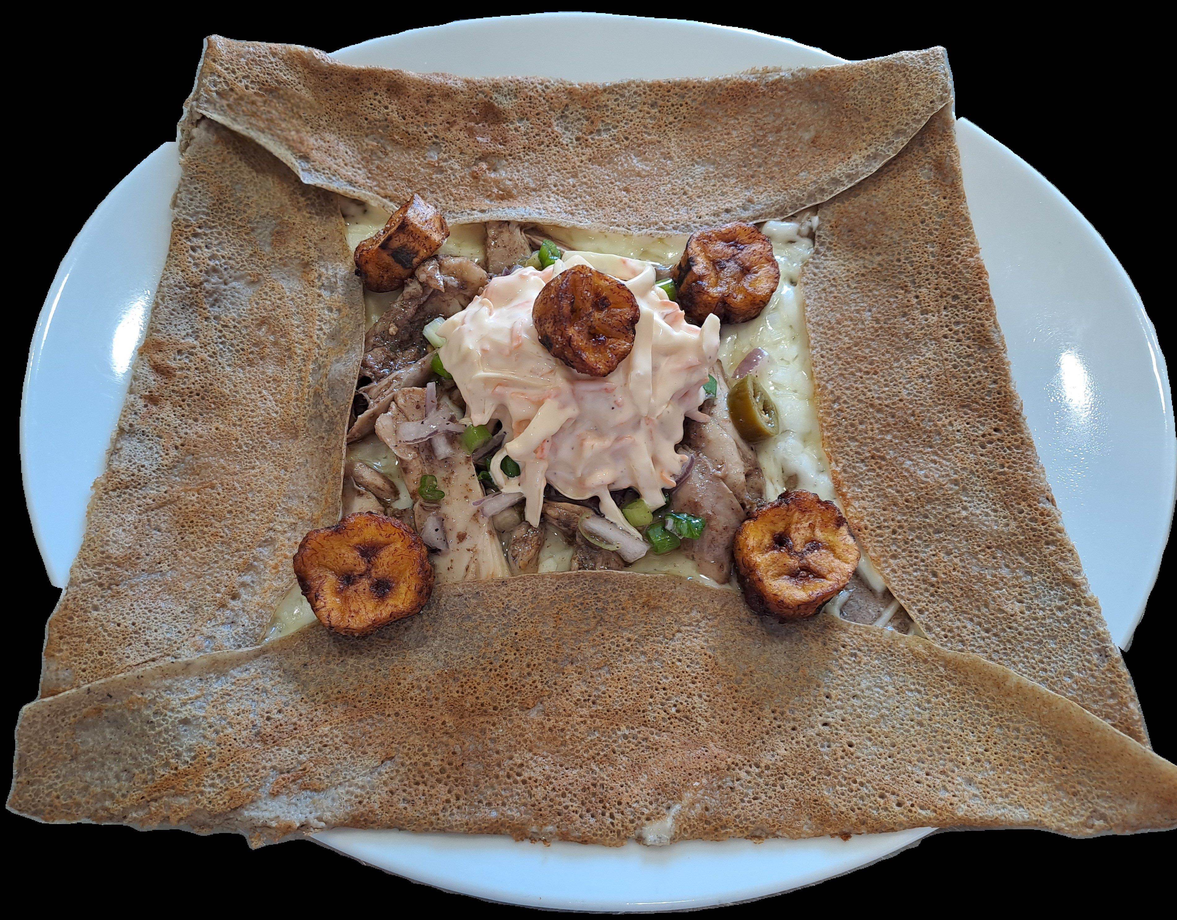 Mozzarella/Emmental, Poulet Pimenté Jerk, Banane Plantain, Coleslaw, Sauce Créole