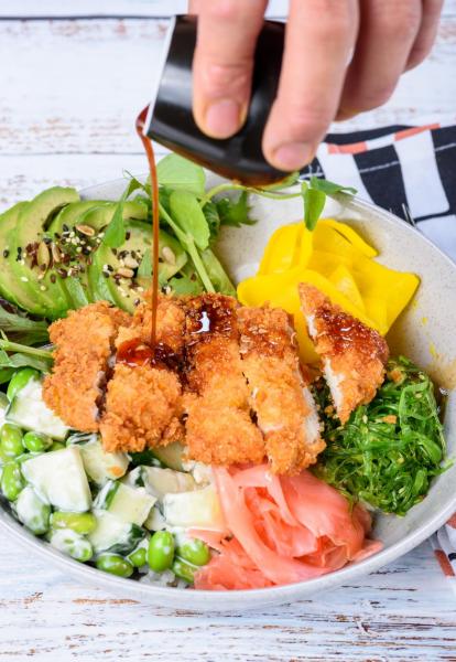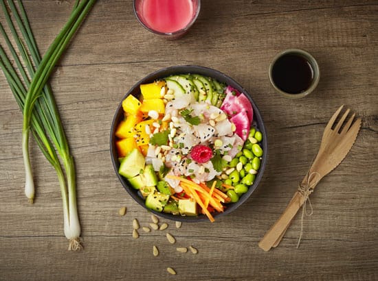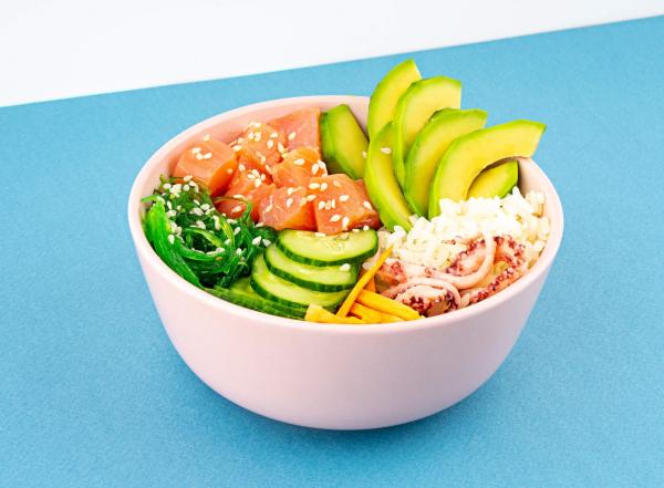 Saumon mariné au soja, Salade de chou japonaise, Avocat, Oignon rouge, Tomates Kumato, Concombres, Sauce Kaz à Poke, Sé…