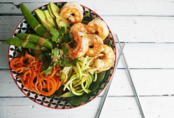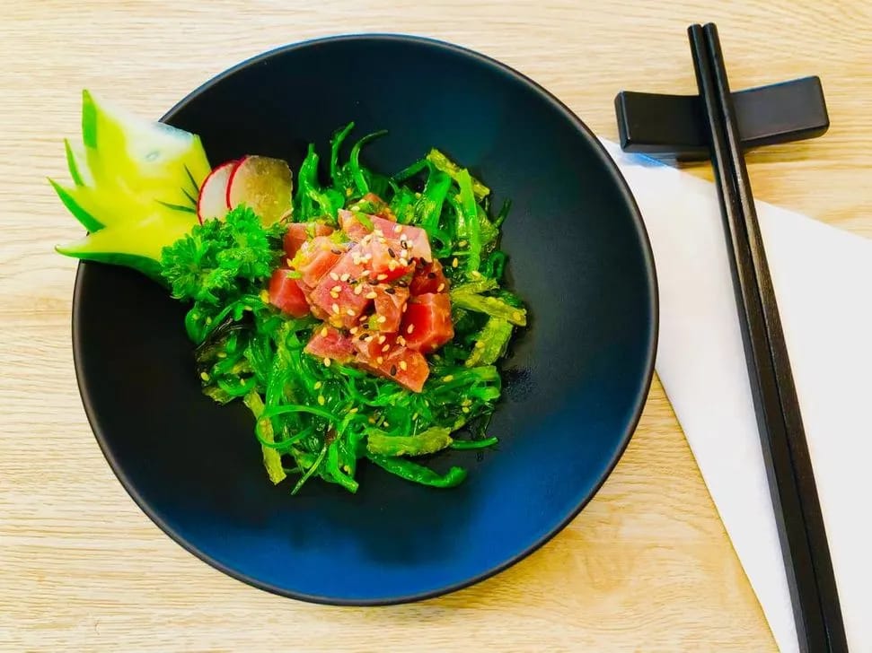 Thon mariné au teriyaki, Chou rouge mariné, Wakamé, Carottes, Avocat, Mangue, Crème cheese citronnée, Oignons frits, Sé…