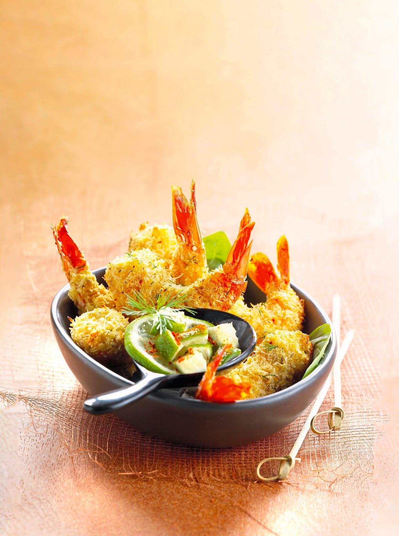 Crevettes grillées, Carottes, Guacamole, Concombres, Tomates cerises, Crème de cheese au thon, Mangue, Coco râpé