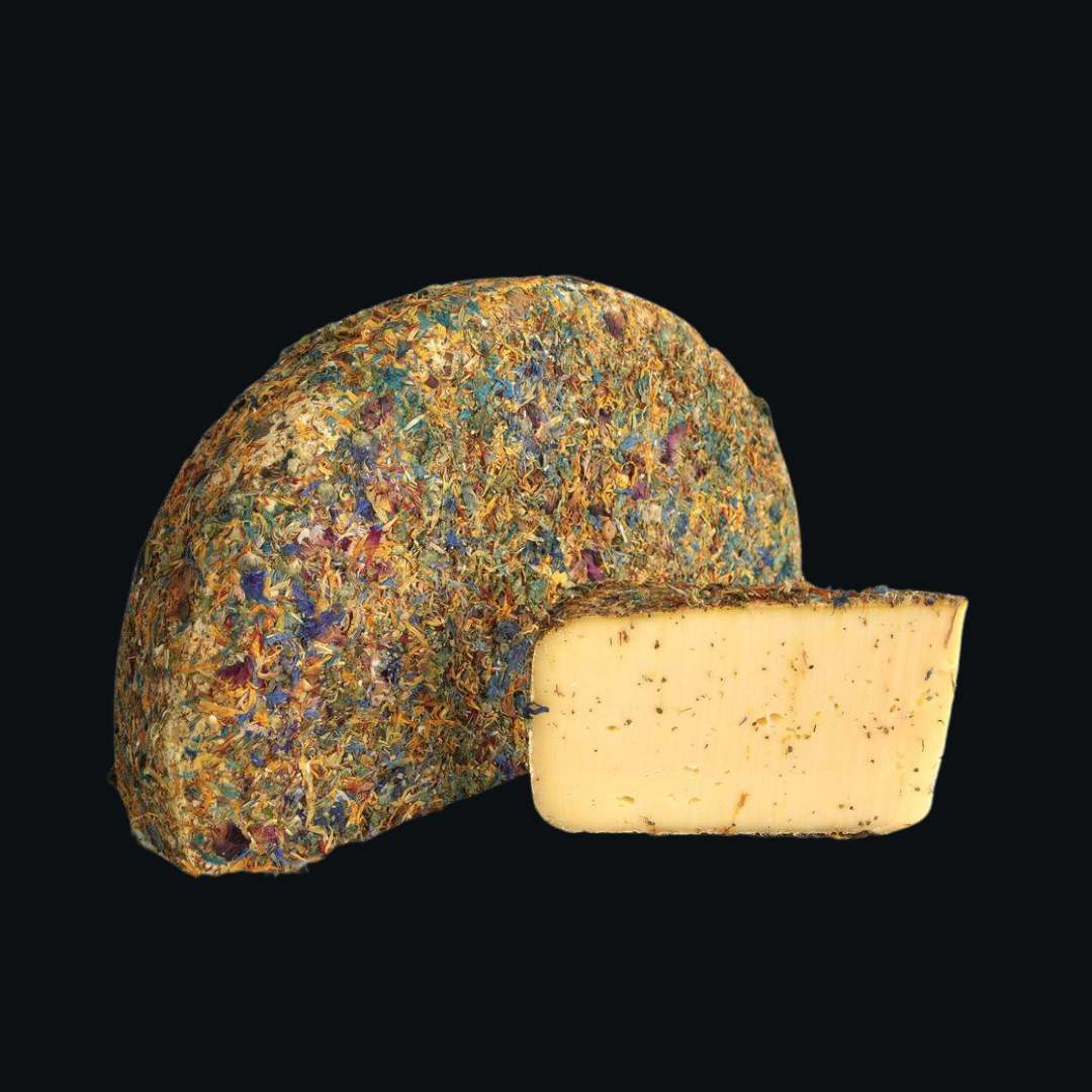 Fromage enrobé de fleurs sauvages comestibles : mauve, bleuet, souci, fraise, rose, foin, pissenlit…Son goût est doux, aux saveurs de noisettes et de fleurs. Les parfums des pétales se diffusent dans la pâte, offrant à ce fromage des saveurs uniques.