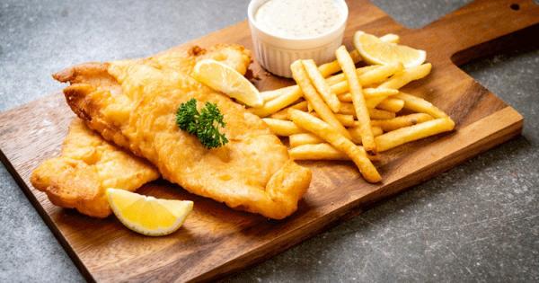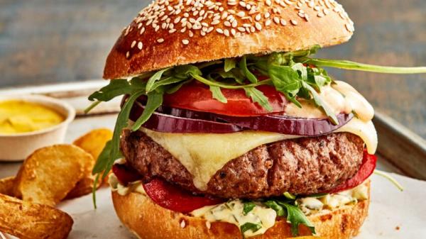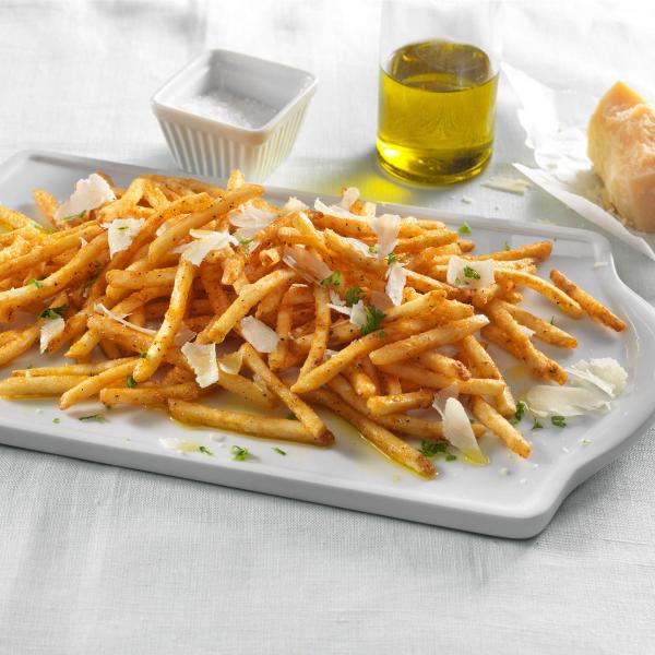Oignons caramélisés, Salade, Sauce au fromage bleu, Frites