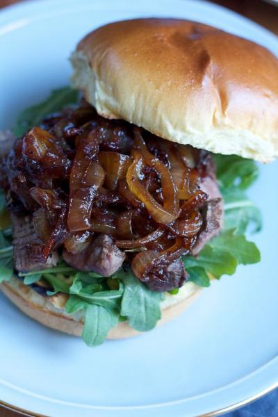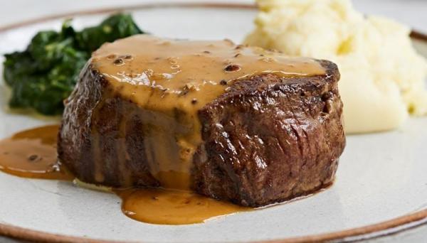 Poivre frotté, Oignions caramélisé, Salade Mixte