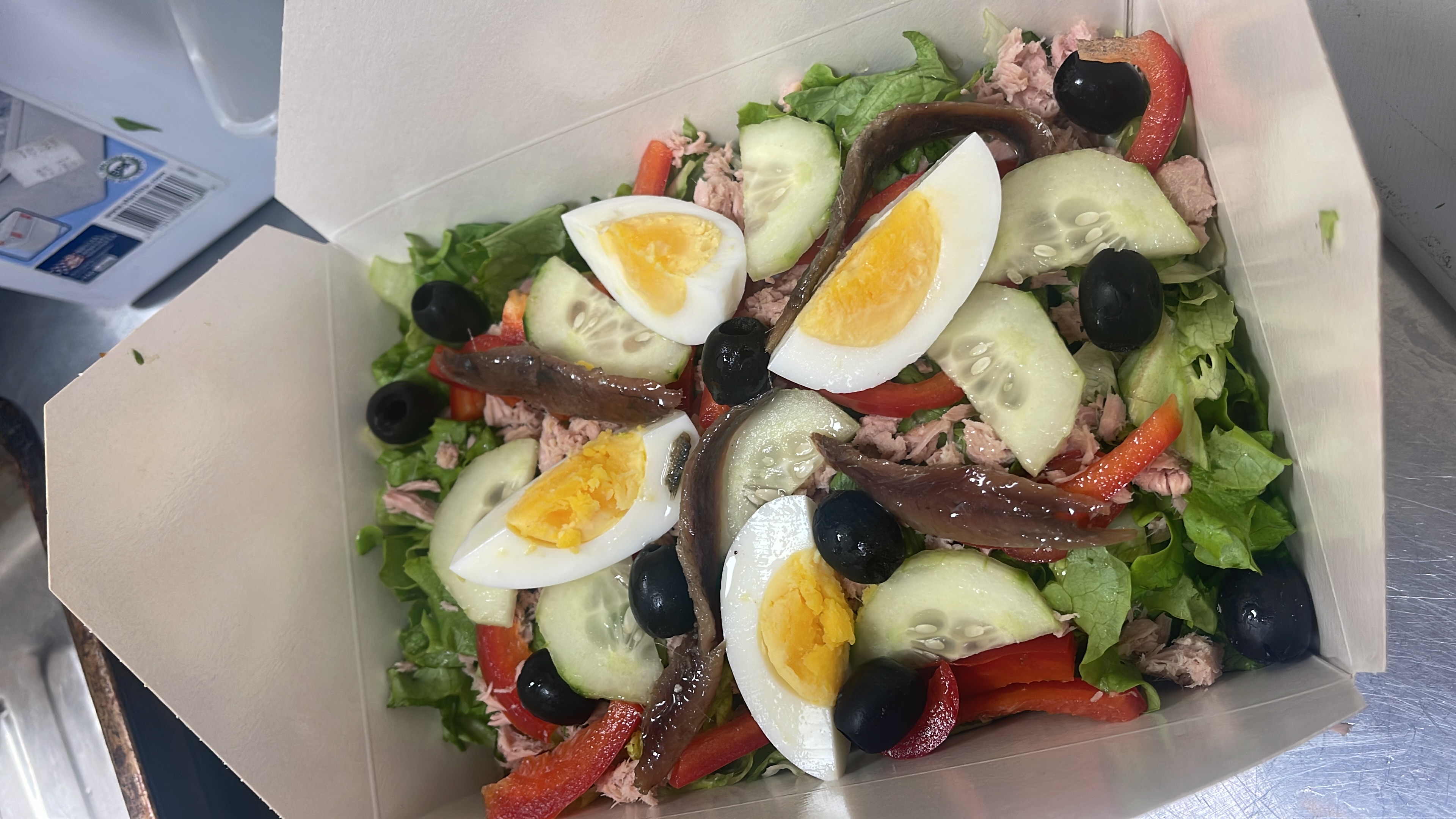 Salade, Tomate, Thon, Oeuf, Anchois, Concombre, Poivron, Olives