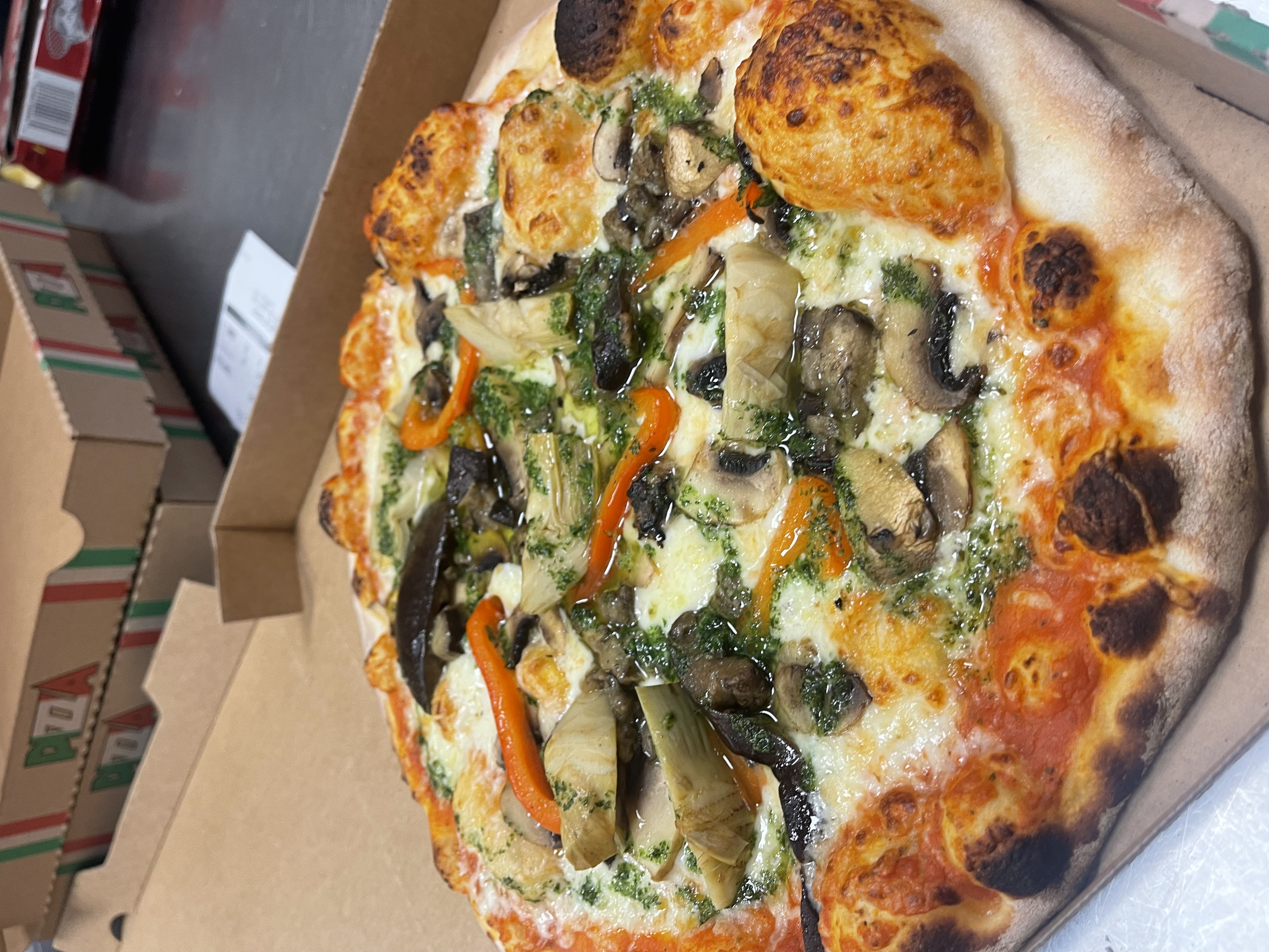 Sauce tomate, fromage, champignons, artichauts, poivrons, aubergine, persillade