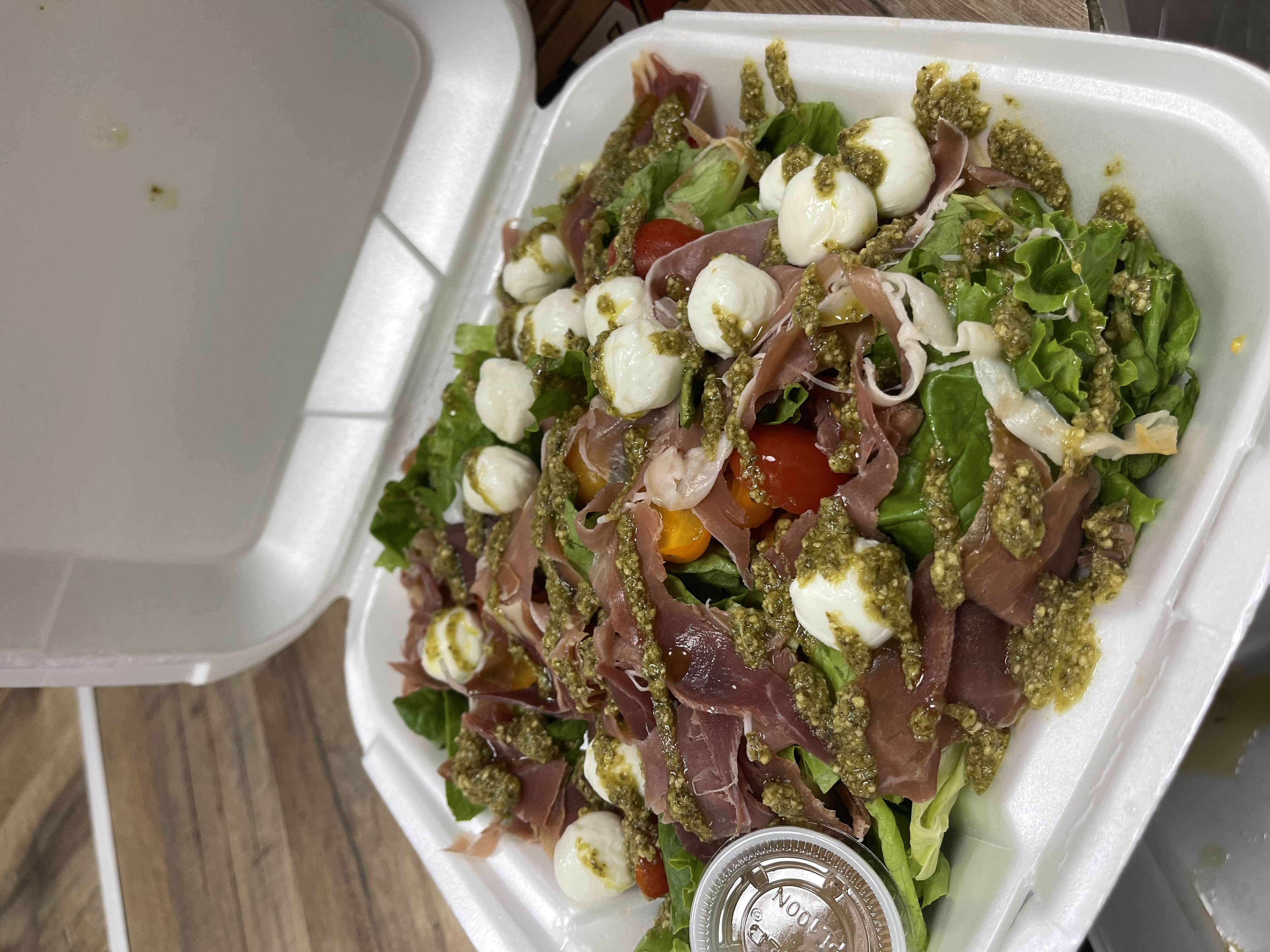 Salade, Tomate, Mozza, Jambon cru, Pesto