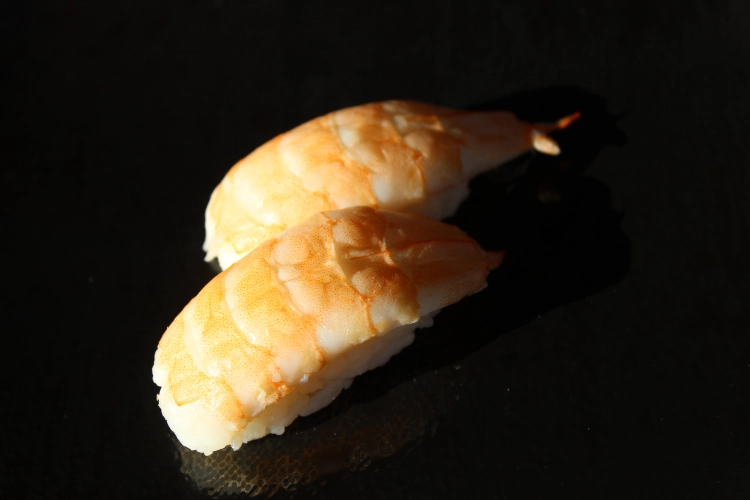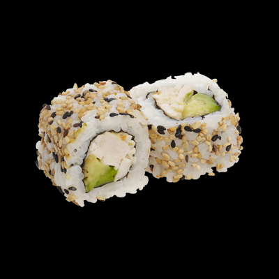 Crevette, Crevette panée, Avocat, Concombre, Top saumon, Mayo épicée, Sauce anguille, Tobiko, Sésame
