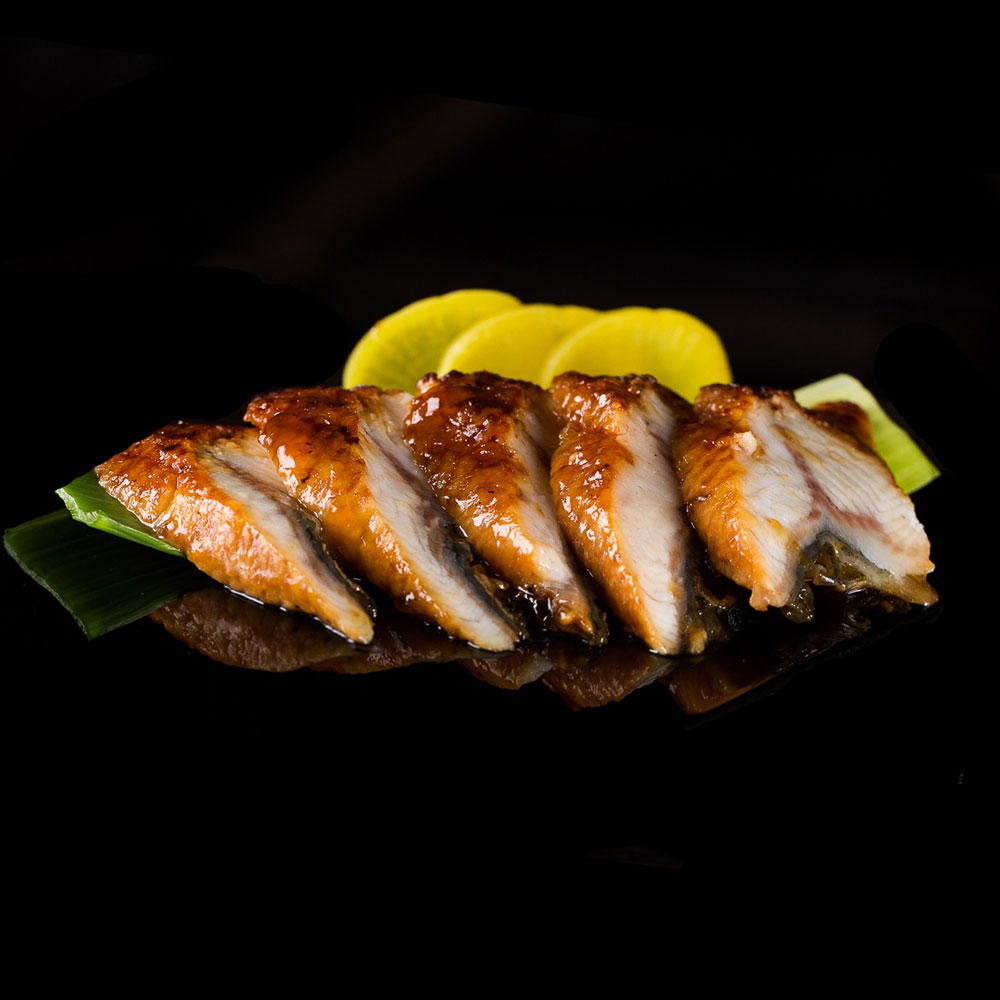 Magret de canard entier juste snacké, Sauce miso mangue & Gingembre, Servi froid en fines tranches, Accompagné de roque…