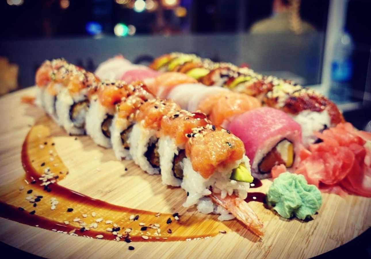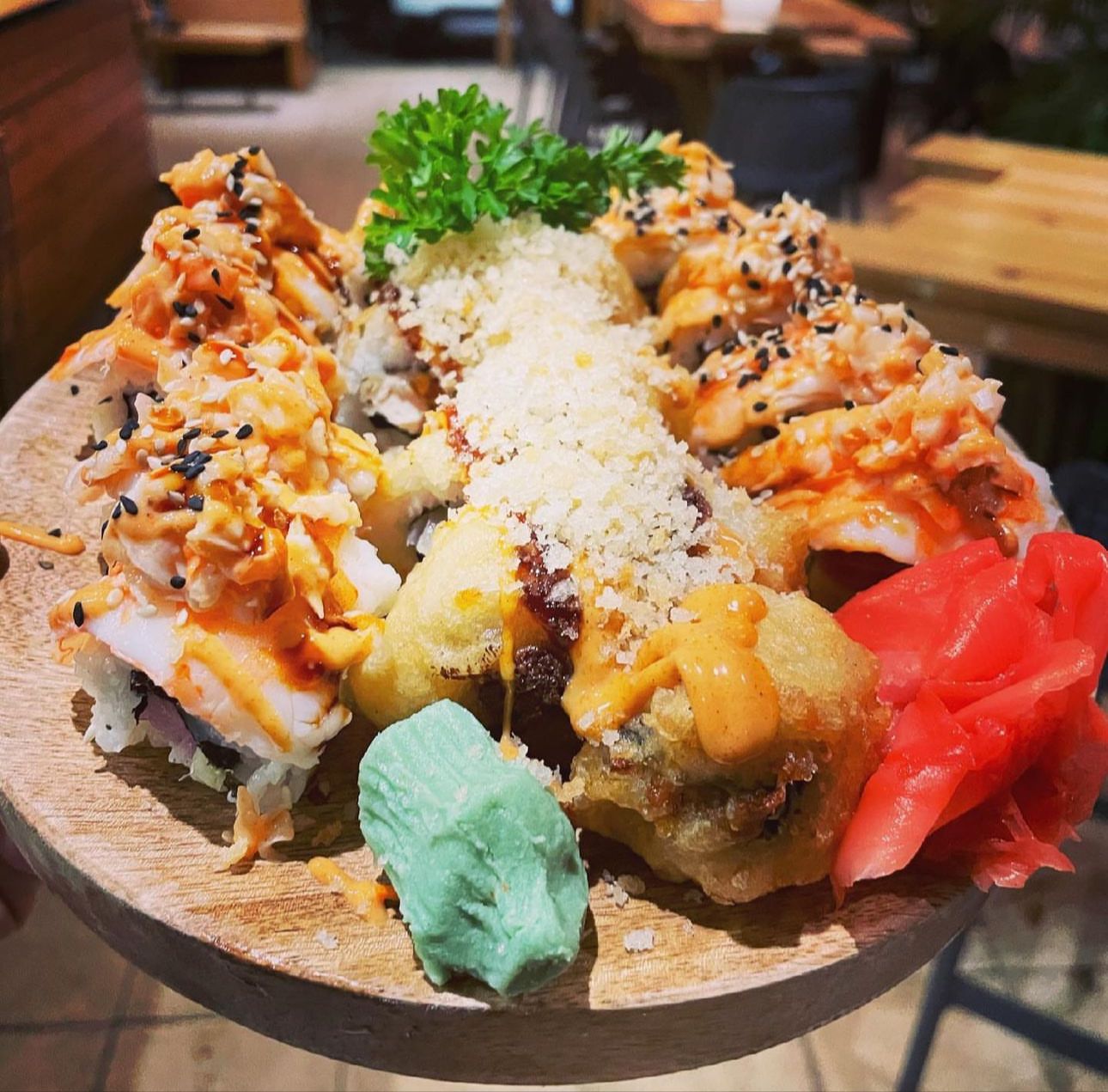 Crevette panéee, Thon épicé, Cream cheese, Avocat, Poireaux frits, Sauce soja sucrée, Tobiko, Mayonnaise épicée