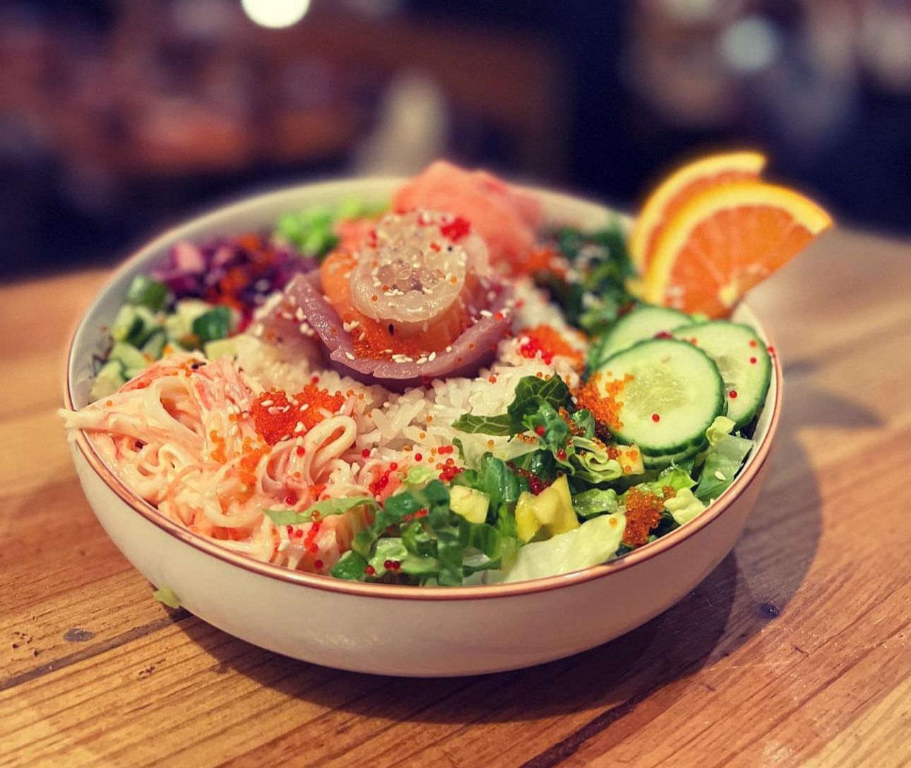 Thon ou saumon ou Amachi, Bol de riz, Avocat, Concombre, Edamame, Carottes, Choux rouge, Kanikama, Tobiko, Sésame, Waka…