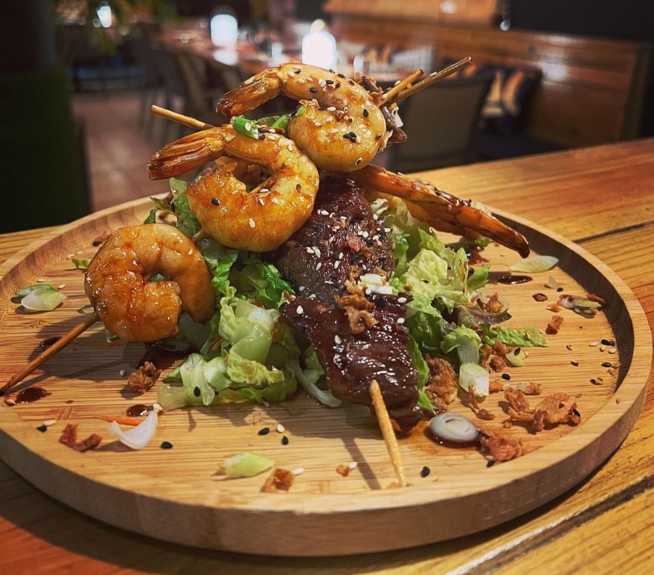 Viande de boeuf marinée puis snackée, Servie en fines tranches sur son lit de roquette, Riz sauté ax légumes, Cacahuète…