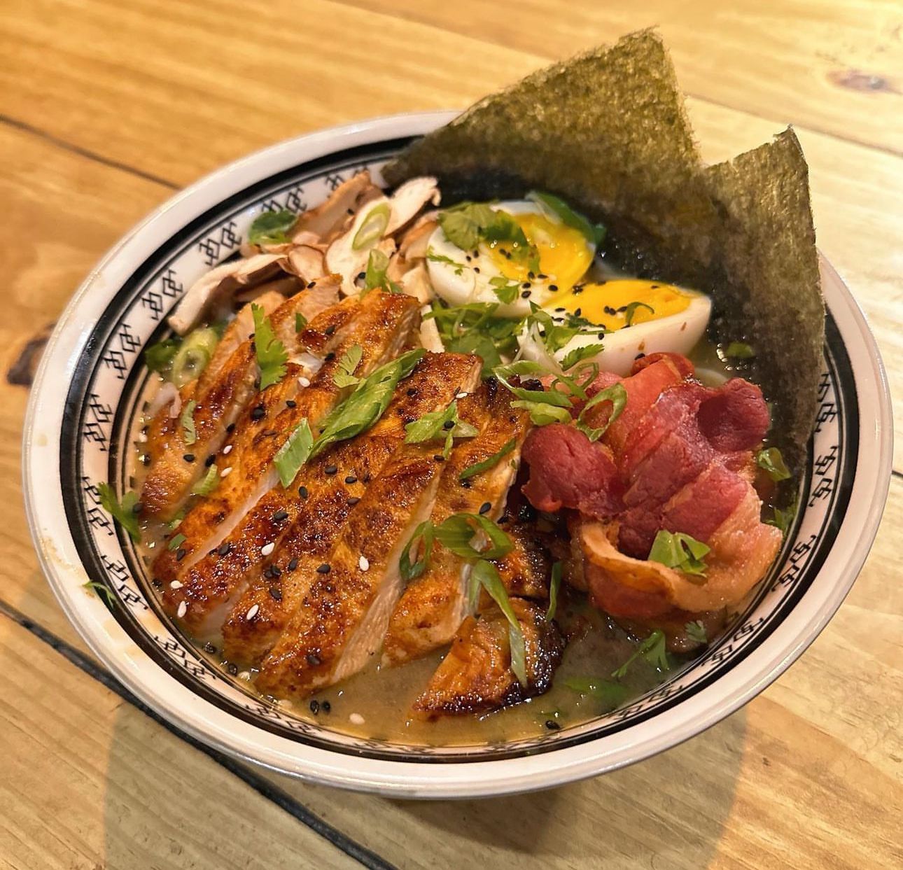 Oeuf mollet Nouilles aux oeufs, Nori, Shiitaké, Cives, Coriandre, Poulet grillé, Bacon