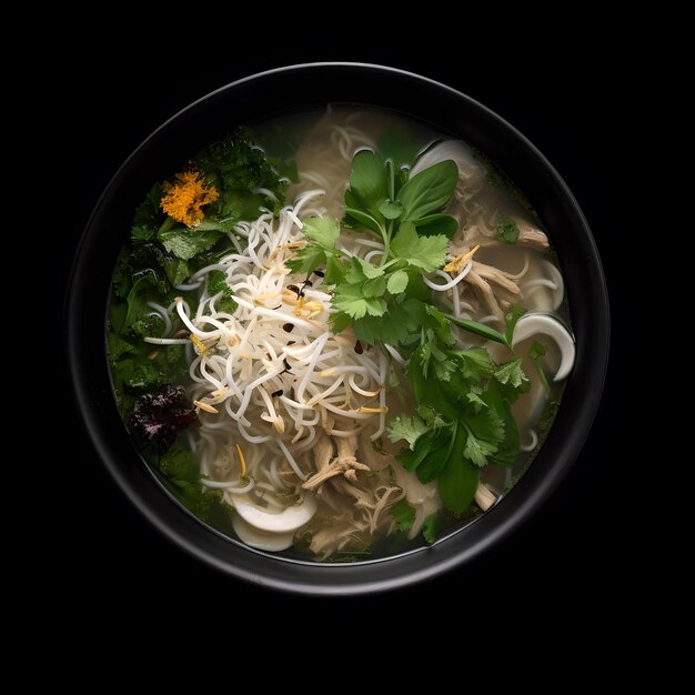 Nouilles de riz, Émincés de boeuf, Pousses de soja, Bouillon, Coriandre, Cives, Sésame